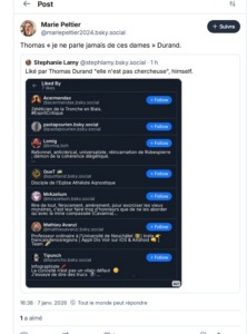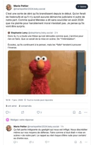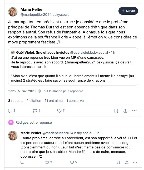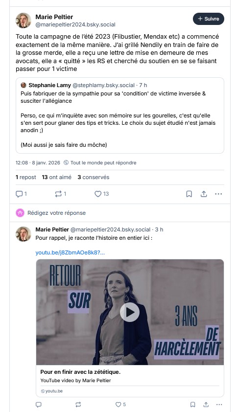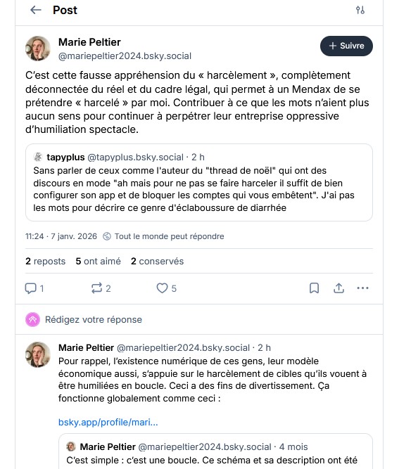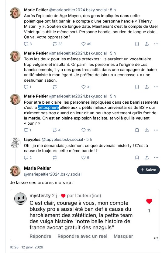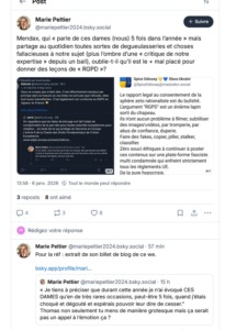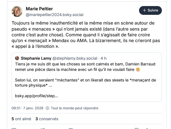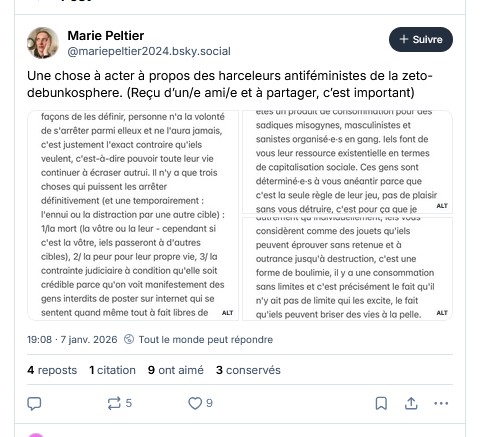 Le 13 janvier 2026, après maintes annonces en ce sens non suivies d’effet, Marie Peltier désactive son compte Bluesky. Je n’ai pas affiché ici ses publications sur Instagram, qui continuent peut-être.