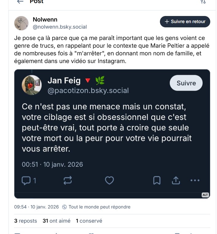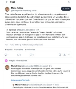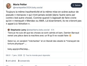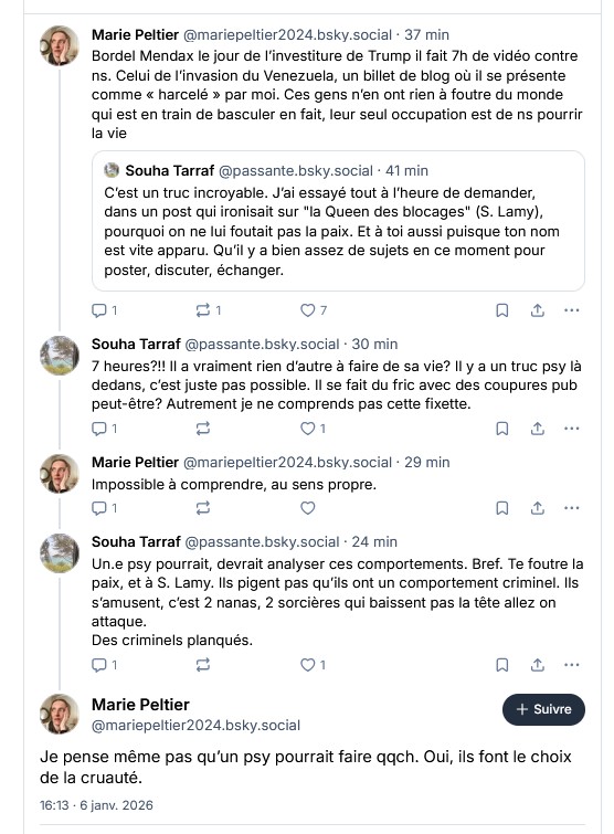 7 janvier 2026– Marie Peltier partage un texte qu’elle dit envoyé par une amie. Elle approuve ce texte qui énonce que les personnes qu’elle accuse de la harceler n’arrêteront qu’une fois qu’ils seront morts, ou bien si Marie Peltier meurt, (mais alors ils chercheront une autre cible, qui sans doute devra mourir à son tour). Des internautes ont annoncé avoir signalé ce message à PHAROS.