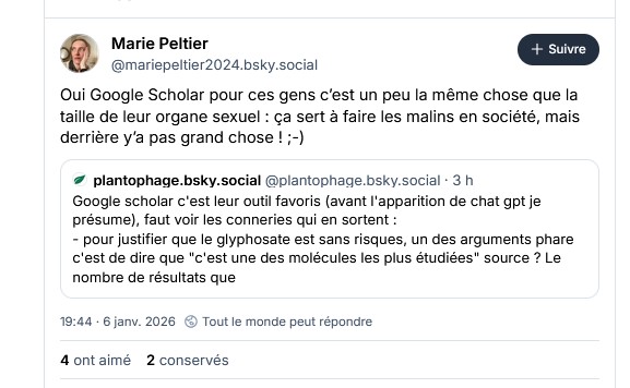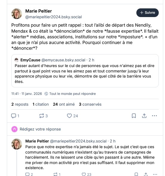 Réaliser une veille régulière des réseaux sociaux afin d’évaluer comment mon travail est reçu, perçu, compris, afin d’y apporter des améliorations ou de répondre aux attaques que ne manque pas de susciter une critique rationaliste des discours trompeurs, me met dans l’obligation d’être exposé aux propos que j’ai ici collectés à titre illustratif. À tout le moins, j’estime que ce qui se passe démontre la justesse de mes critiques de 2023 concernant aussi bien la prétendue expertise que le comportement de brute numérique de Marie Peltier à qui j’ai maintes fois demandé (comme d’autres de ses cibles) de cesser de m’agonir quotidiennement alors même que je ne lui réponds plus depuis longtemps.