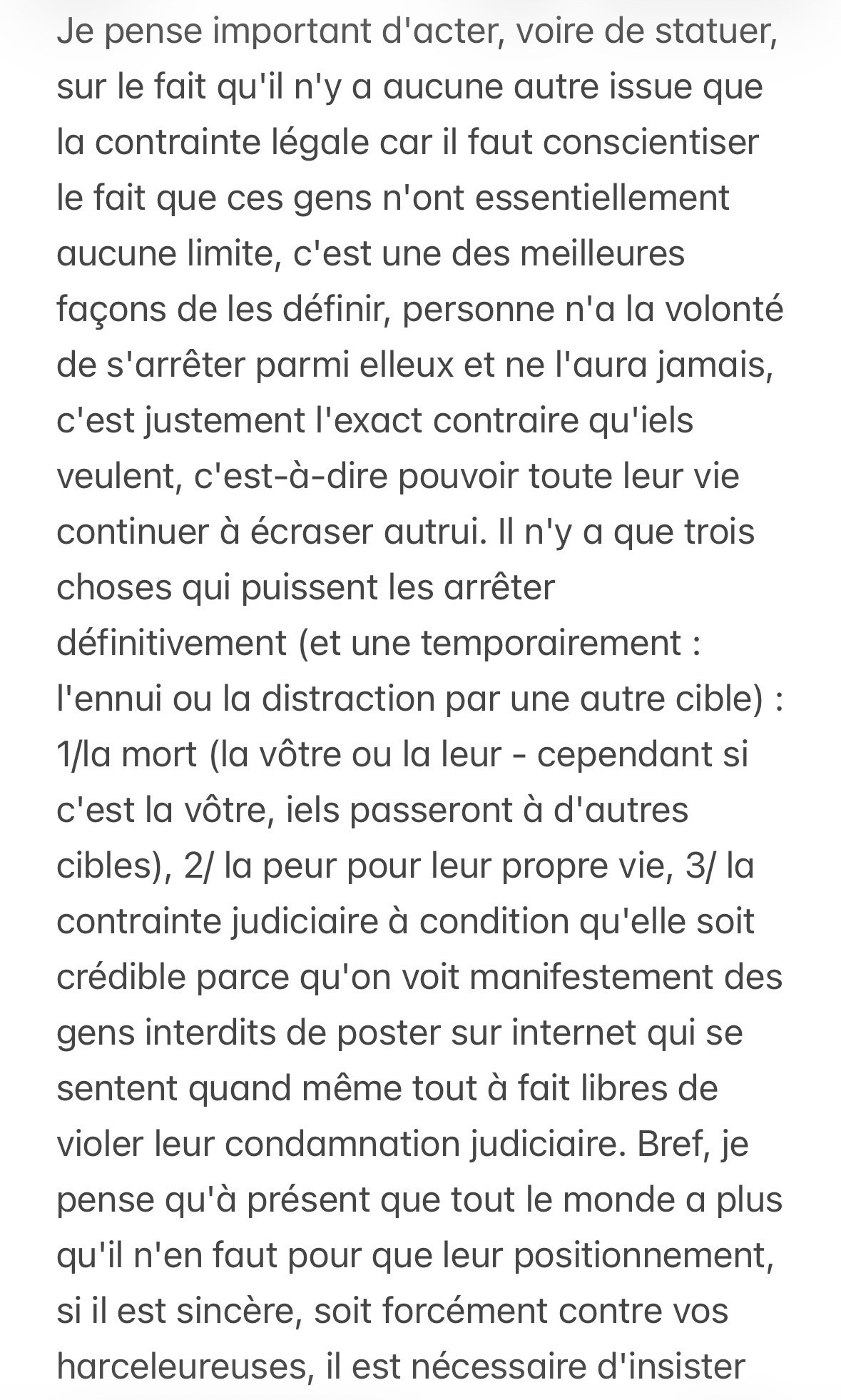 Même si cela va sans dire, je précise ici que je condamnerais toute attaque contre les personnes dont je dénonce ici le comportement. Aucun harcèlement n’est justifiable, même quand on croit qu’il est mérité car la cible serait elle même coupable. C’est non. Cela doit s’arrêter. Non seulement pour ne causer de drame, mais aussi pour conserver le droit plein et entier de critiquer les discours à travers des analyses sourcées et argumentées.