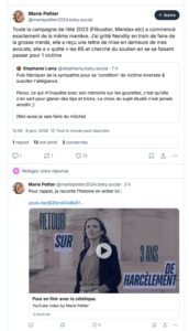 Pour rappel, en janvier 2025, j’ai passé 7 heures en vidéo à lire les écrits publics de Marie Peltier et Stéphanie Lamy sur une période de 20 jours. J’y lisais leurs propos et ceux des personnes qu’elles choisissaient de relayer sur leurs pages afin de montrer ce qui se passait, car un cyberharcèlement, quand on veut le raconter, on doit pouvoir le montrer . Une procédure judiciaire est engagée après plusieurs appel à cesser ces attaques.