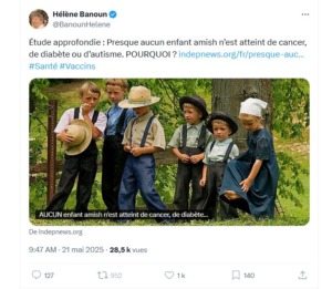 Une affirmation circule depuis quelque temps sur les réseaux sociaux, notamment chez les militants antivaccins : « Presque aucun enfant amish n’est atteint de cancer, de diabète ou d’autisme. » Cette idée, relayée par des sites peu fiables comme GlobalResearch ou IndepNews, voudrait faire croire que le refus des vaccins, de la médecine moderne ou d’un mode de vie industrialisé expliquerait un supposé état de santé exceptionnel. Comme on peut s’y attendre, cette thèse ne repose sur aucun fondement scientifique.