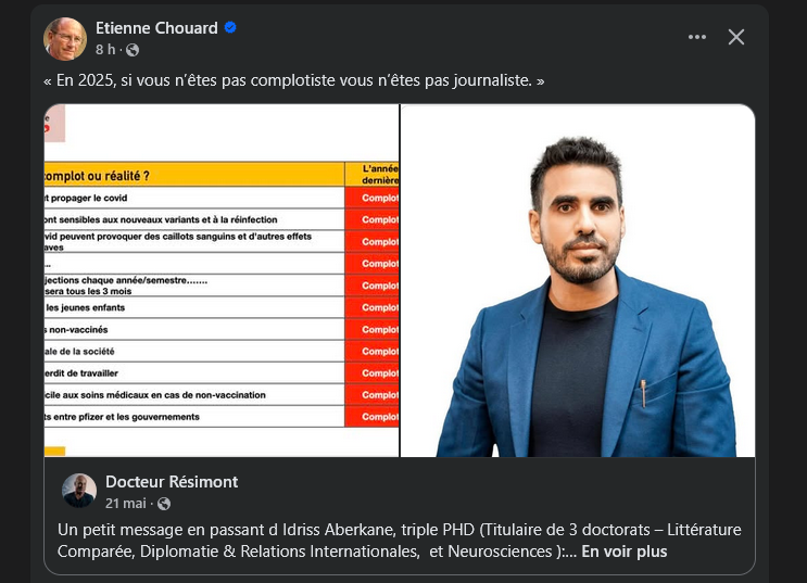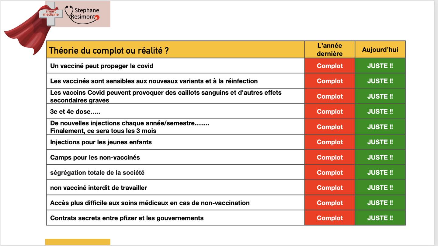 Mais le Dr Résimont, licencié de son poste dans un hôpital bruxellois en raison de ses positions anti-vaccination, en rajoute encore en citant des racoleurs complotistes bien connus comme Idriss Aberkane ou Jean-Dominique Michel.