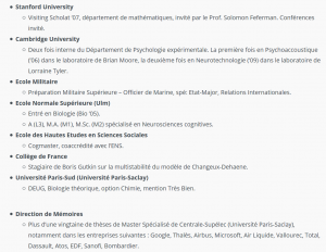 Il est vrai qu’il a eu une L3 en biologie, puis un M1 en sciences cognitives (Cogmaster), dans la filière neurosciences cognitives. En revanche il est faux qu’il ait obtenu un M2 de l’ENS, que ce soit en neurosciences cognitives (sur son CV) ou en Systems Biology (sur Linkedin).