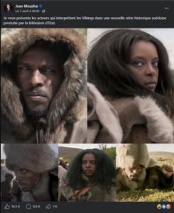Il publie sur toutes ses pages le message suivant : « Je vous présente les acteurs qui interprètent les Vikings dans une nouvelle série historique suédoise produite par la télévision d’Etat. » Il accompagne son texte de 5 photographies de deux acteurs à la peau foncée… et aux yeux bleus. Ce que Jean Messiha exprime sans le dire c’est que tout cela est anormal, incohérent, problématique. Les vikings ne peuvent pas être noirs, et donc la télévision publique suédoise cherche à enfoncer des images trompeuses dans la tête des gens ; c’est de la propagande. Mais Jean Messiha est là pour le dénoncer.