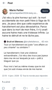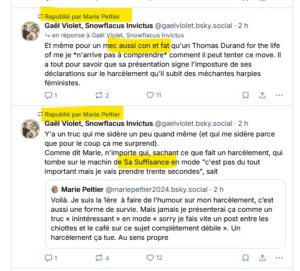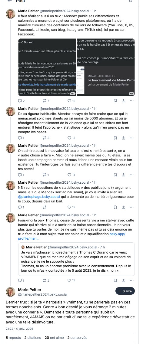 Réaliser une veille régulière des réseaux sociaux afin d’évaluer comment mon travail est reçu, perçu, compris, afin d’y apporter des améliorations ou de répondre aux attaques que ne manque pas de susciter une critique rationaliste des discours trompeurs, me met dans l’obligation d’être exposé aux propos que j’ai ici collectés à titre illustratif. À tout le moins, j’estime que ce qui se passe démontre la justesse de mes critiques de 2023 concernant aussi bien la prétendue expertise que le comportement de brute numérique de Marie Peltier à qui j’ai maintes fois demandé (comme d’autres de ses cibles) de cesser de m’agonir quotidiennement alors même que je ne lui réponds plus depuis longtemps.