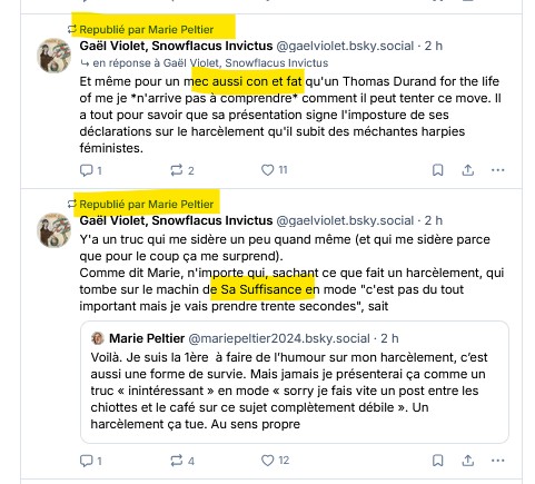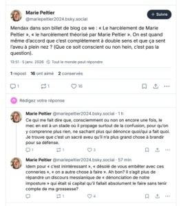 Voici les messages relevé par quelques amis ou par moi-même au cours de l’année 2025, alors même que Marie Peltier et Stéphanie Lamy ont annoncé porter plainte contre moi pour diffamation et harcèlement, et alors que j’ai annoncé à mon tour des poursuites contre elles.