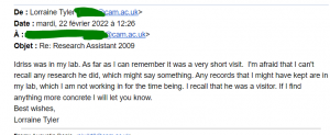 Traduction « Idriss était dans mon laboratoire. Pour autant que je m’en souvienne, ce fut une visite très brève. J’ai bien peur de n’avoir aucun souvenir de la recherche qu’il a pu faire, ce qui pourrait bien vouloir dire quelque chose. Les éventuelles traces de tout cela sont dans mon laboratoire om je ne travaille pas actuellement. Je me souviens qu’il était « visitor ». Si je trouve quoi que ce soit de concret, je vous le ferai savoir. »