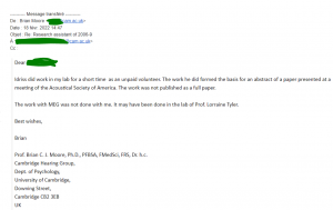 Traduction « Idriss a travaillé un court moment dans mon laboratoire en tant que bénévole non payé. Son travail a servi de base à l’abstract (résumé scientifique) d’un papier présenté à un séminaire de l’Acoustical Society of America. Ce travail n’a aps donné lieu à un véritable article scientifique. le travail en MEG n’a pas été fait avec moi. Il peut avoir été fait dans le laboratoire du prof. Lorraine Tyler. »