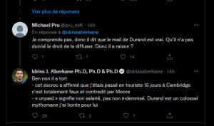 Un étudiant de Cambridge qui souhaite garder l’anonymat m’a proposé son aide pour contacter le professeur Brian Moore. Je vous rappelle que monsieur Aberkane a écrit sur son CV et a dit publiquement à plusieurs reprises qu’il avait été invité là bas par ce professeur, que son travail était jugé assez important pour qu’on le rémunère, qu’il a été co-auteur final d’un article avec monsieur Moore. Ce concept de co-auteur final m’avait interpellé en 2016 et m’avait permis de voir qu’en réalité ce ‘n”tait pas un article mais une communication dans un congrès par poster, ce qui est pas mal du tout mais qui ne correspond pas, dans les sciences du vivant à une véritable publication revue par les pairs.
