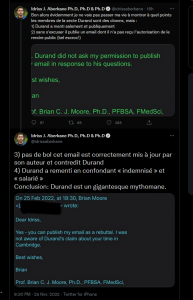 En faisant cela Idriss Aberkane apporte sa validation personnelle à l’authenticité des mails de Brian Moore diffusés ci-dessus. Une authenticité que j’aurais par ailleurs été dans l’incapacité de prouver à tous ceux qui auraient choisi de m’accuser de les avoir inventés. Le manque d’intelligence d’une telle réaction est assez inespéré. Depuis le 25 février, Idriss Aberkane s’est récyclé en expert de géopolitique et fait des lives très suivis où il « analyse » la crise ukrainienne avec la même pseudo-autorité qui a accompagné ses élucubrations sur la pandémie. Désormais, il fera son beurre sur la guerre, une situation où la désinformatione st encore plus nocive que lors d’une épidémie