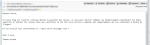 Les clients des casinos sont des adultes consentants dont on doit respecter le droit d’aller dépenser leur argent comme bon leur semble. Il n’est pas question de les juger, de les rabaisser, de prétendre qu’ils seraient plus biaisés que les autres. Néanmoins, le respect de cette liberté s’accompagne de la liberté ici exprimée dans ce billet de critiquer l’idée selon laquelle ils feraient leurs choix de manière réellement libre. Les influences sont multiples pour les encourager à jouer davantage, et si cet article est écrit, c’est en raison d’un email reçu hier de la part d’une certaine Marie.
