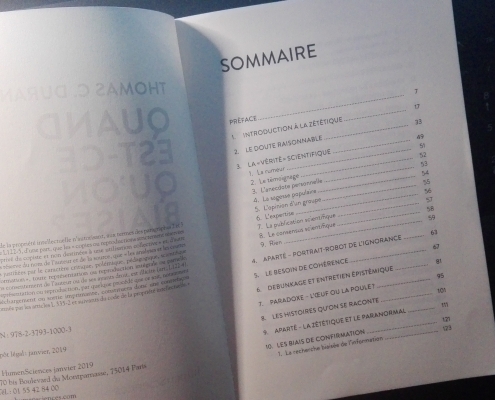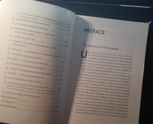 J’ose croire que ce livre est un bel objet qui permet d’avancer à son rythme au milieu des idées fondatrices de la zététique et de glaner quelques références en bas de page. Il couvre ce que j’appelle l’Arc 1 de la Tronche en biais : 10 épisodes où les concepts sont apportés les uns après les autres dans un ordre qui ne doit rien au hasard, pour aboutir à un cas d’école où ils sont mis en pratique dans l’épisode 10, encore inédit à ce jour mais qui devrait être tourné en janvier. Il y sera question de sexe, de genre et de biais cognitifs, et vous devinez bien qu’il va bousculer les représentations de pas mal de monde sur ces questions qui clivent beaucoup plus qu’elles ne devraient si l’on prenait la peine d’écouter réellement ce que disent ceux qui pensent différemment.