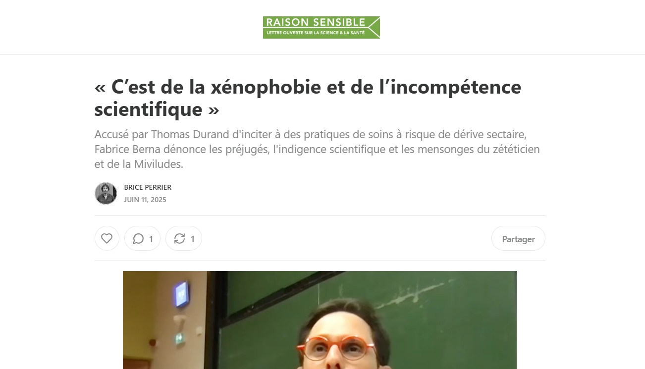 Dans un article publié le 11 juin 2025 sur Raison sensible, Fabrice Berna, relayé par Brice Perrier, m’accuse successivement de « xénophobie », « incompétence scientifique » et même de « complotisme », en réaction à une critique argumentée que j’ai publiée à propos d’une conférence universitaire à Strasbourg, où des pratiques de soins non conventionnelles (PSNC) ont été défendues en dépit de la rigueur méthodologique et de nombreuses alertes épistémologiques.