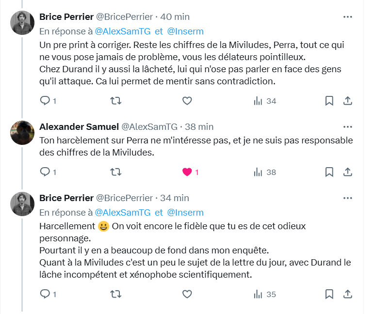 Quelques heures après la publication de cet article, sur Twitter/X, Brice Perrier redouble d’injure