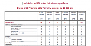Cette croyance religieuse littéraliste est citée par les sondeurs pour mesurer sa corrélation avec les croyances complotistes. Comme c’était attendu, cette corrélation est forte. Ce créationnisme « Terre Jeune » est surtout le marqueur d’un rejet de la méthode scientifique.