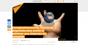 Etudier l’adhésion d’une partie de la population à des idées conspirationnistes est une tâche importante et complexe. Complexe, car il est bien évident que le conspirationniste ne sera que peu motivé à répondre honnêtement à un sondage s’il juge que les sondages sont un outil de manipulation. Importante parce que ces idées virales ont des conséquences sur les comportements des individus et sur la société. Le cas le plus grave est peut-être le mouvement antivax qui sème la panique chez les jeunes parents et met en danger de nombreuses vies.